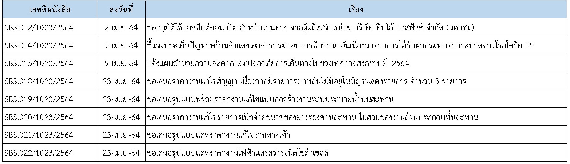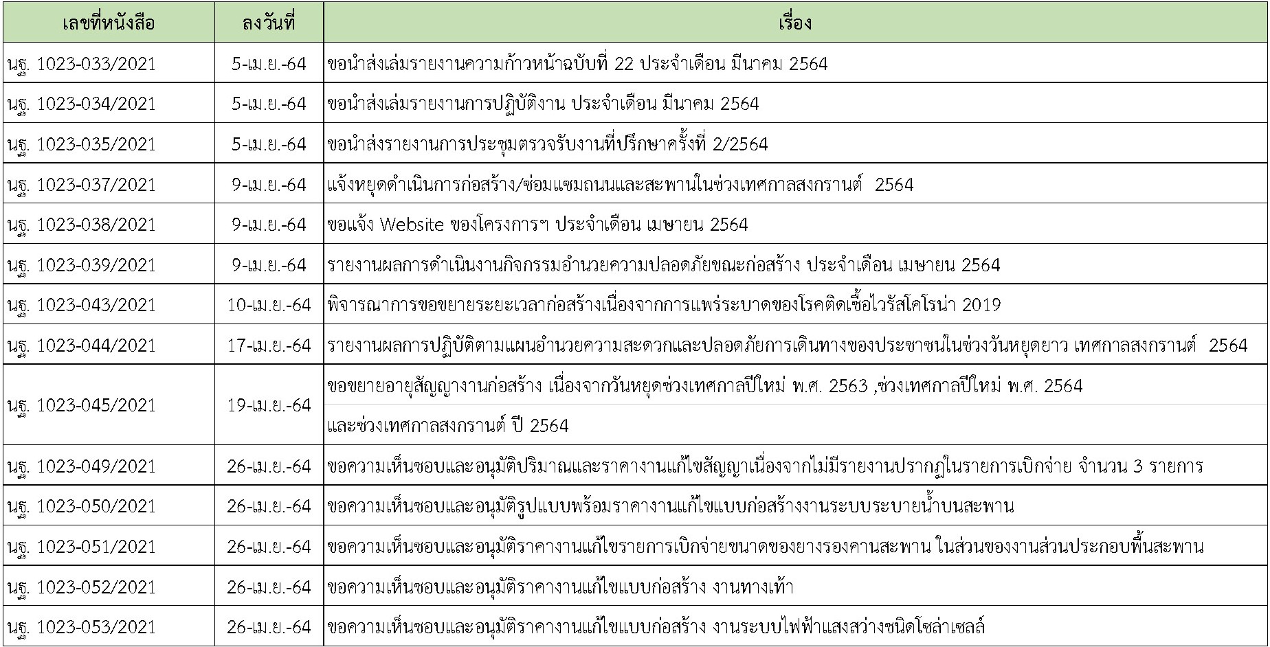 ในการดำเนินงานควบคุมงานก่อสร้าง ได้มีการจัดส่งเอกสารหนังสือต่างๆ ระหว่างกรมทางหลวงชนบท ที่ปรึกษา และผู้รับจ้างดังนี้