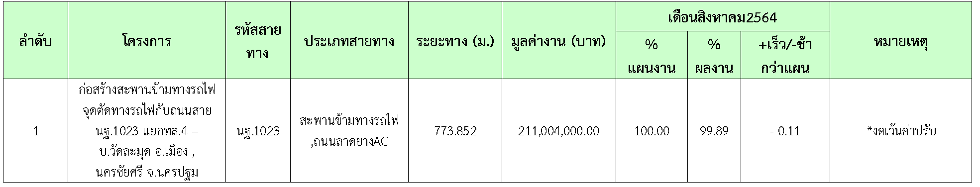 ในเดือน สิงหาคม2564 มีความก้าวหน้าของงานก่อสร้างและการตรวจรับงาน ดังสรุปในตารางที่ 2.3-1