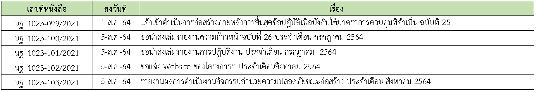 ในการดำเนินงานควบคุมงานก่อสร้าง ได้มีการจัดส่งเอกสารหนังสือต่างๆ ระหว่างกรมทางหลวงชนบท ที่ปรึกษา และผู้รับจ้างดังนี้