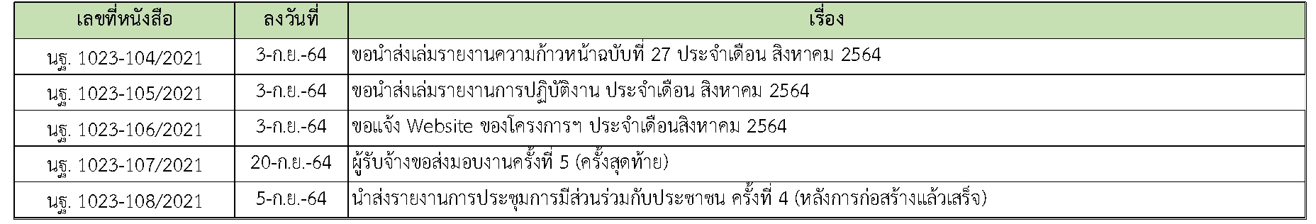 ในการดำเนินงานควบคุมงานก่อสร้าง ได้มีการจัดส่งเอกสารหนังสือต่างๆ ระหว่างกรมทางหลวงชนบท ที่ปรึกษา และผู้รับจ้างดังนี้