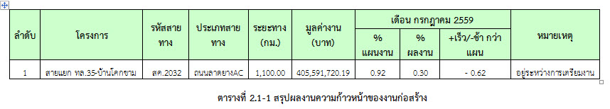 ความก้าวหน้าของเดือนกรกฎาคม 2559 ของการปฏิบัติงาน (0.92%) กำลังดำเนินการก่อสร้างสำนักงานชั่วคราว และยังไม่สามารถเข้าพื้นที่ได้บางส่วน ผลงานความก้าวหน้าแสดงไว้ในตารางที่ 2.1-1 ดังนี้