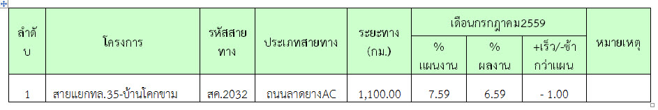 ที่ปรึกษาได้ดำเนินการควบคุมงานก่อสร้าง ในเดือน กรกฎาคม 2559 มีรายละเอียดการดำเนินงานและความก้าวหน้าของงานตามที่กล่าวในบทที่ 2 ข้อ2.2 รายละเอียดความก้าวหน้าของงานในสายทาง