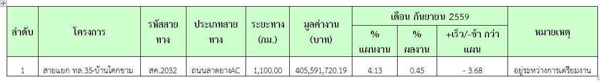 ความก้าวหน้าของเดือนกันยายน 2559 ของการปฏิบัติงาน (4.13%) กำลังดำเนินการเคลียร์สิ่งปลูกสร้าง, ทำวงรอบปิด และยังไม่สามารถเข้าพื้นที่ได้บางส่วน ผลงานความก้าวหน้าแสดงไว้ในตารางที่ 2.1-1 ดังนี้