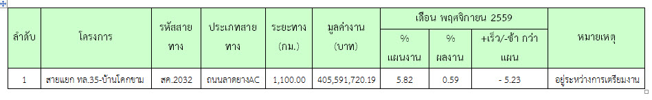 ในเดือน พฤศจิกายน 2559 ยังไม่มีความก้าวหน้าของงานก่อสร้างที่สามารถตรวจรับงานได้ จึงไม่มีการตรวจรับงานใดๆ ดังสรุปในตารางที่ 2.3-1