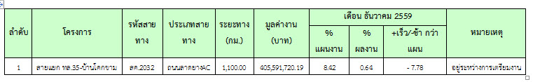 ความก้าวหน้าของเดือน ธันวาคม 2559 ของการปฏิบัติงาน (8.42%) กำลังดำเนินการเคลียร์สิ่งปลูกสร้าง, ทำวงรอบปิด และยังไม่สามารถเข้าพื้นที่ได้บางส่วน ผลงานความก้าวหน้าแสดงไว้ในตารางที่ 2.1-1 ดังนี้
