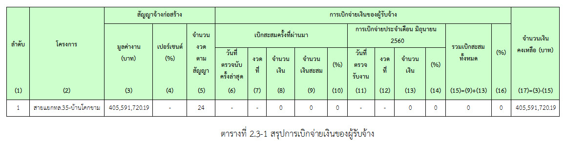 ในเดือนมิถุนายน2560 ยังไม่มีความก้าวหน้าของงานก่อสร้างที่สามารถตรวจรับงานได้ จึงไม่มีการตรวจรับงานใดๆ ดังสรุปในตารางที่ 2.3-1