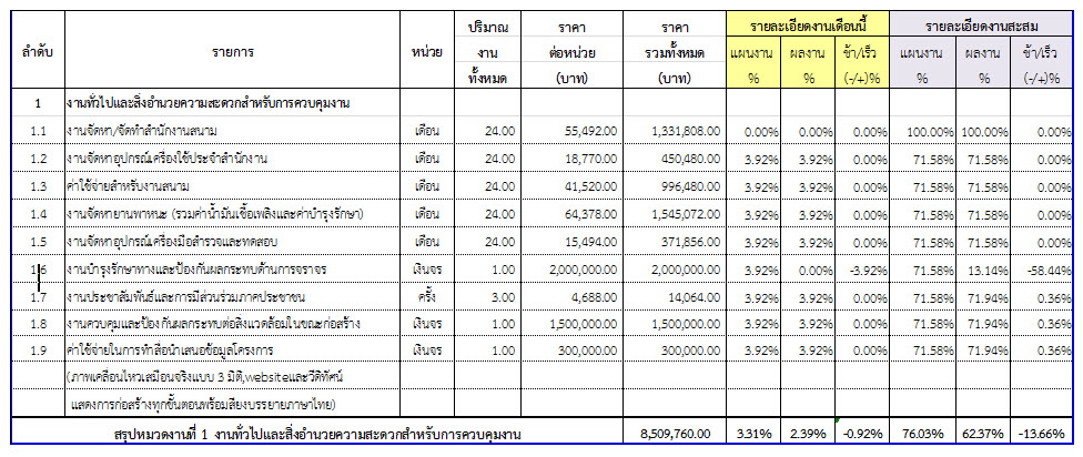 ตารางที่ 2.1-1 สรุปผลงานความก้าวหน้าของงานก่อสร้าง