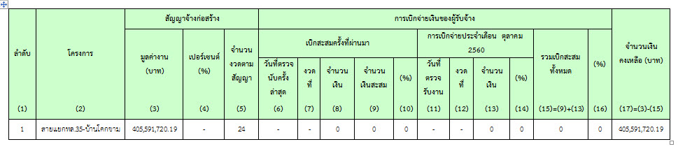 ในเดือน ตุลาคม2560 ยังไม่มีความก้าวหน้าของงานก่อสร้างที่สามารถตรวจรับงานได้ จึงไม่มีการตรวจรับงานใดๆ ดังสรุปในตารางที่ 2.3-1