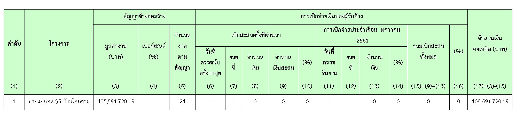 ในเดือน มกราคม2561ยังไม่มีความก้าวหน้าของงานก่อสร้างที่สามารถตรวจรับงานได้ จึงไม่มีการตรวจรับงานใดๆ ดังสรุปในตารางที่ 2.3-1