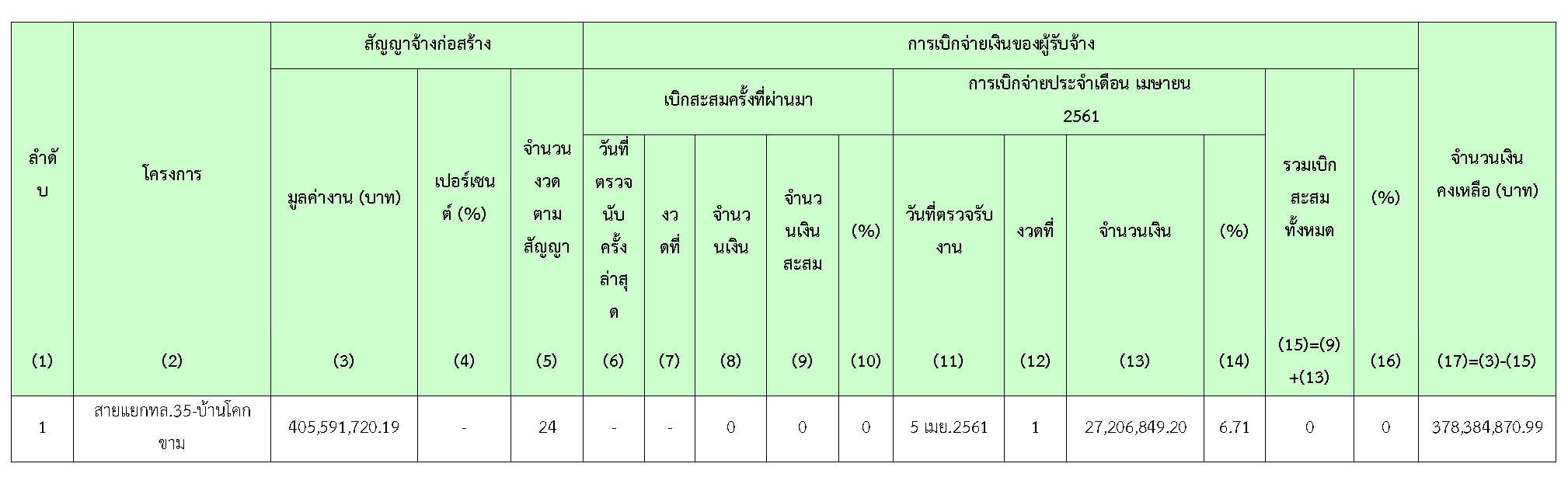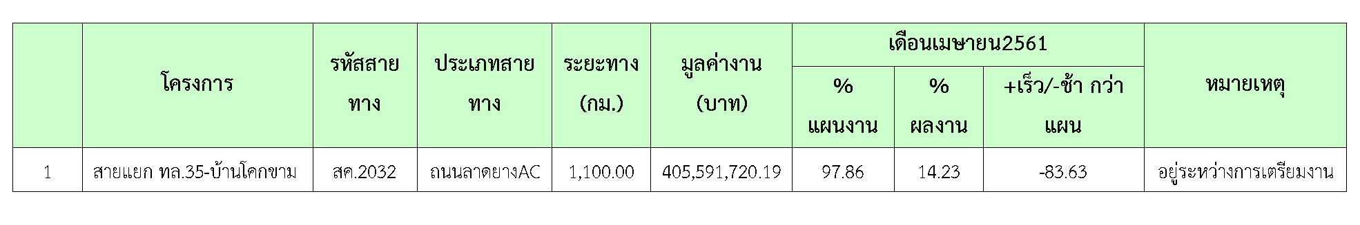 ในเดือน เมษายน2561มีความก้าวหน้าของงานก่อสร้างที่สามารถตรวจรับงานได้ ดังสรุปในตารางที่ 2.3-1