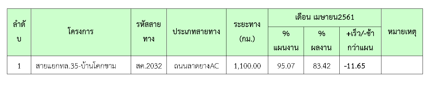 ที่ปรึกษาได้ดำเนินการควบคุมงานก่อสร้าง ในเดือน เมษายน 2561มีรายละเอียดการดำเนินงานและความก้าวหน้าของงานตามที่กล่าวในบทที่ 2 ข้อ2.2 รายละเอียดความก้าวหน้าของงานในสายทาง