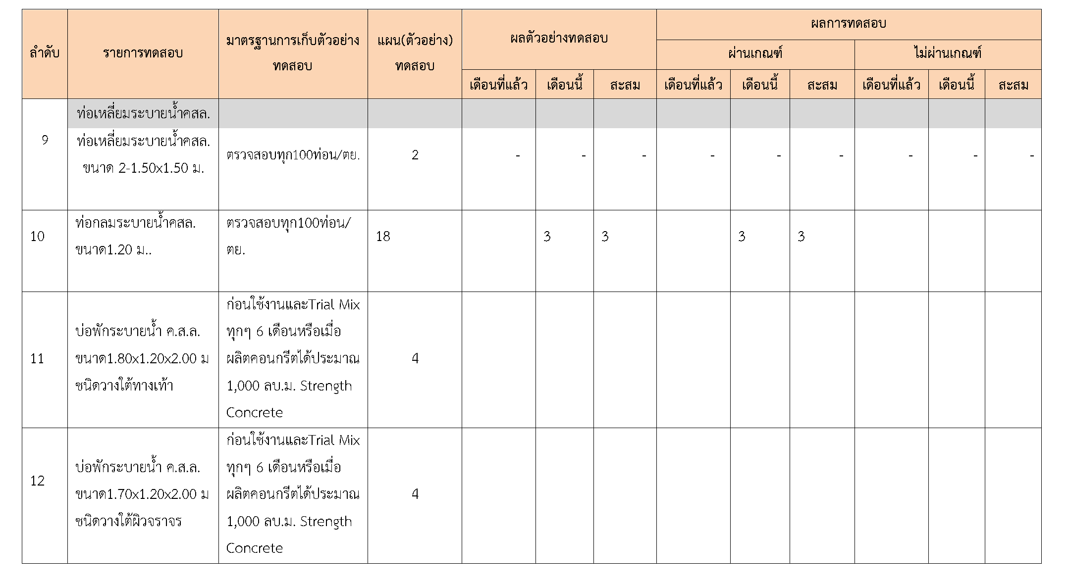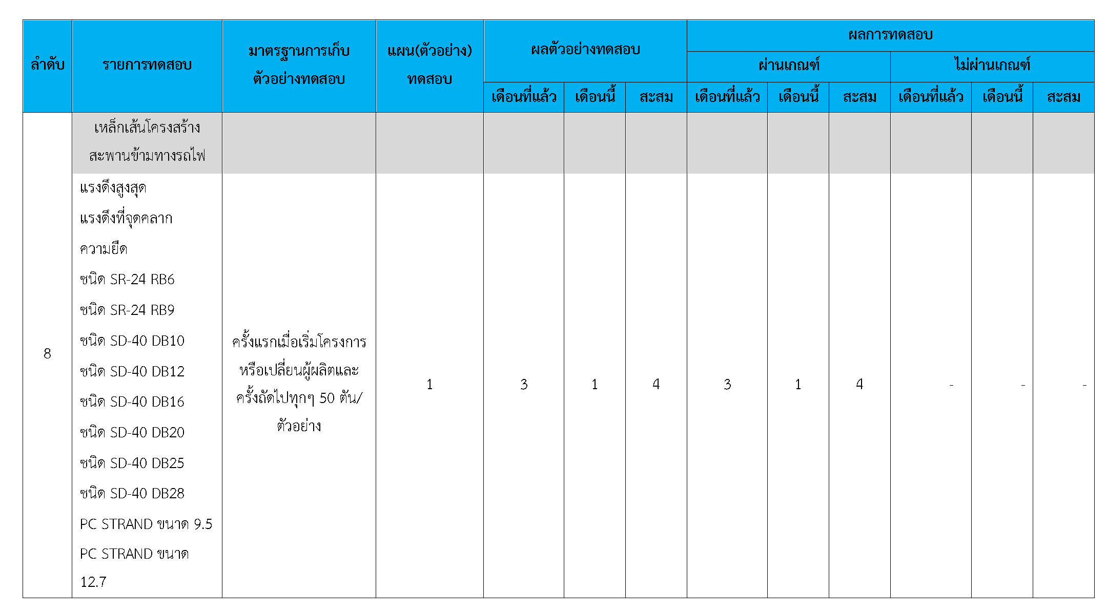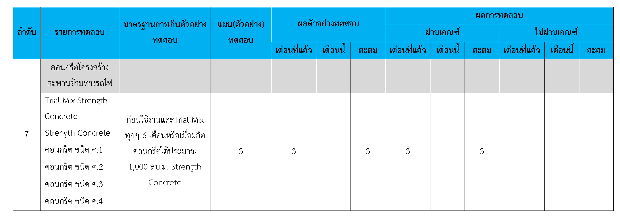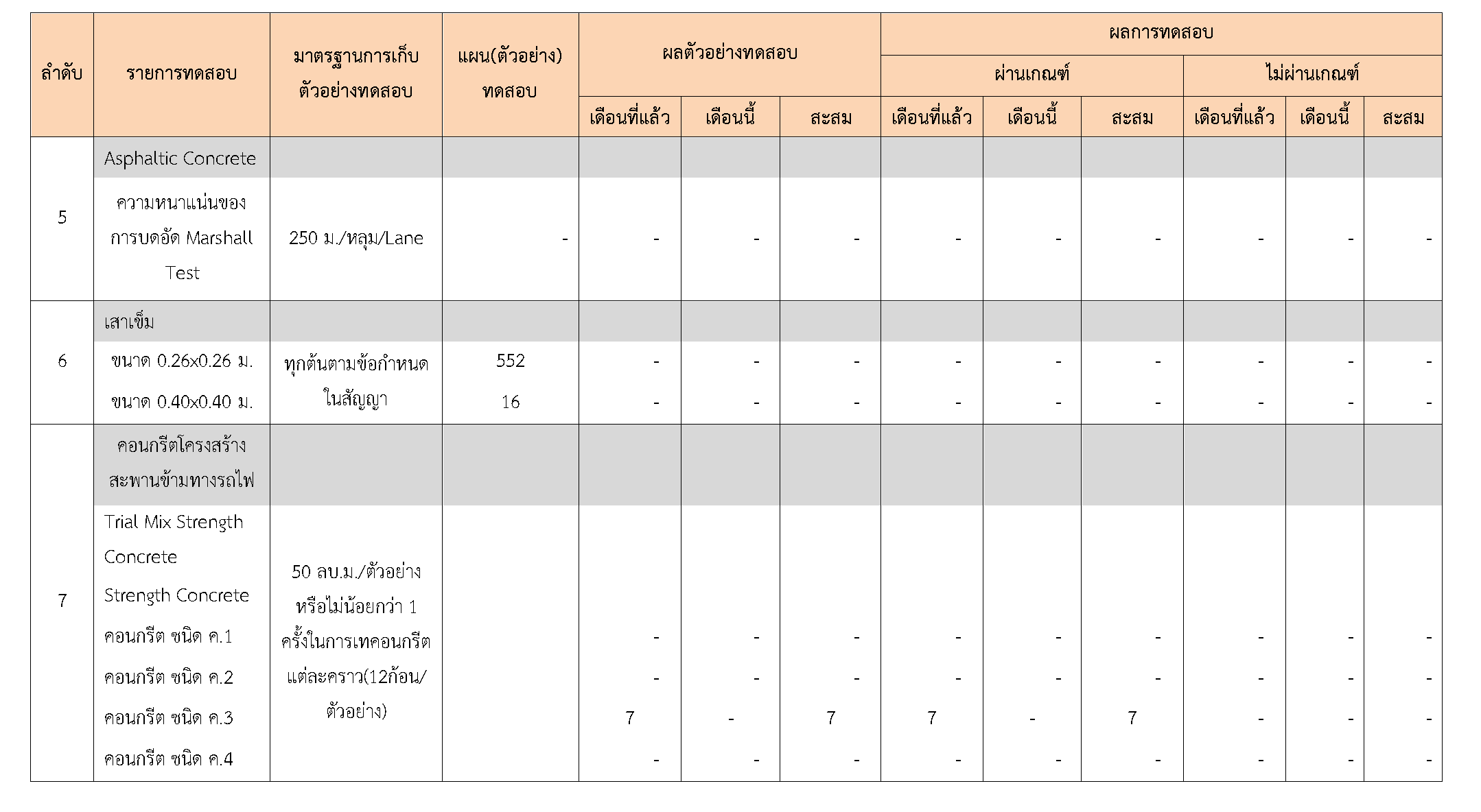 ในระหว่างวันที่ 1-30 เมษายน2561ผู้ว่าจ้างได้เสนอหนังสือขออนุมัติใช้วัสดุถึงที่ปรึกษา โดยที่ปรึกษาได้ตรวจสอบวัสดุดังกล่าวมีผลทดสอบดังตาราง
