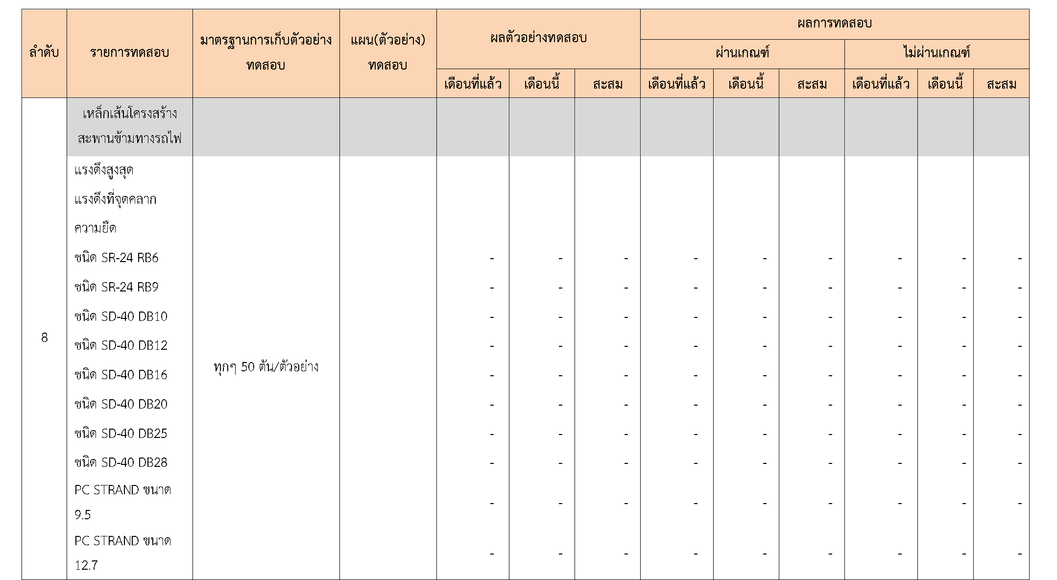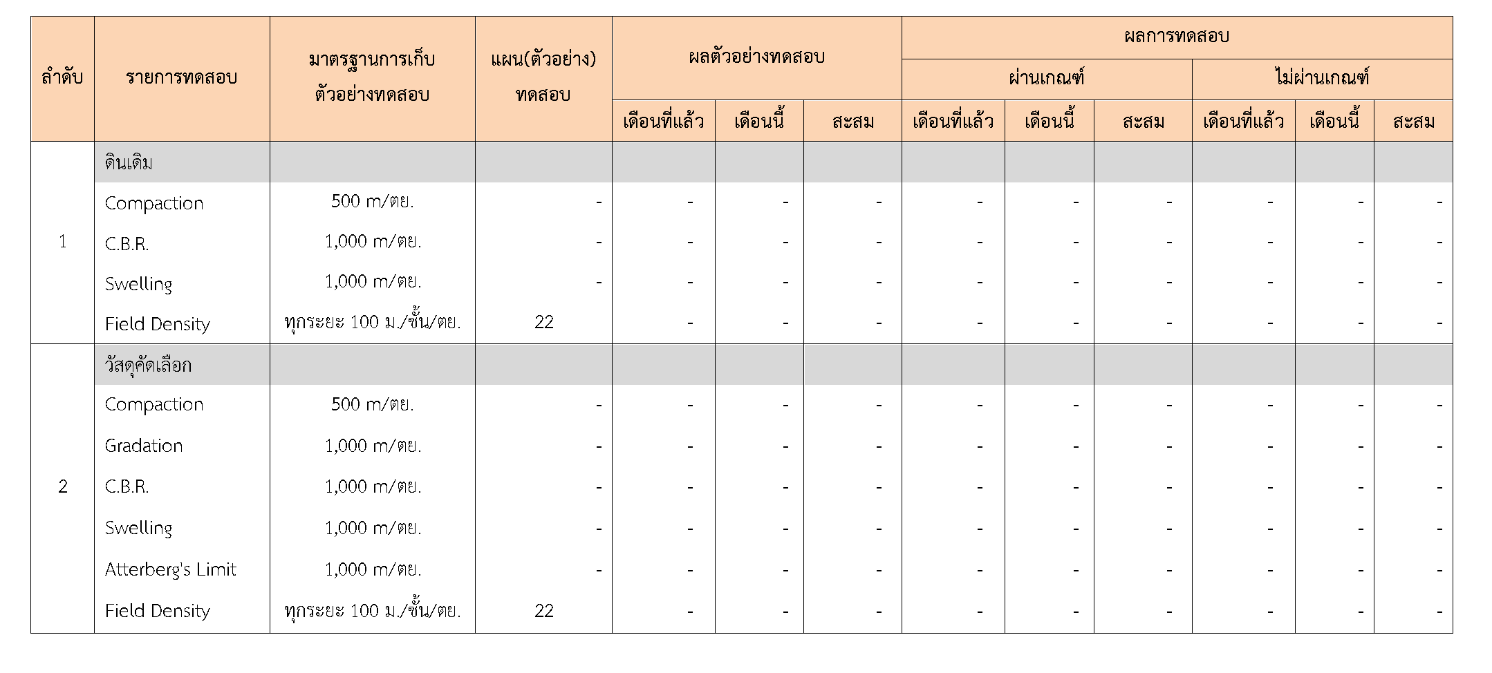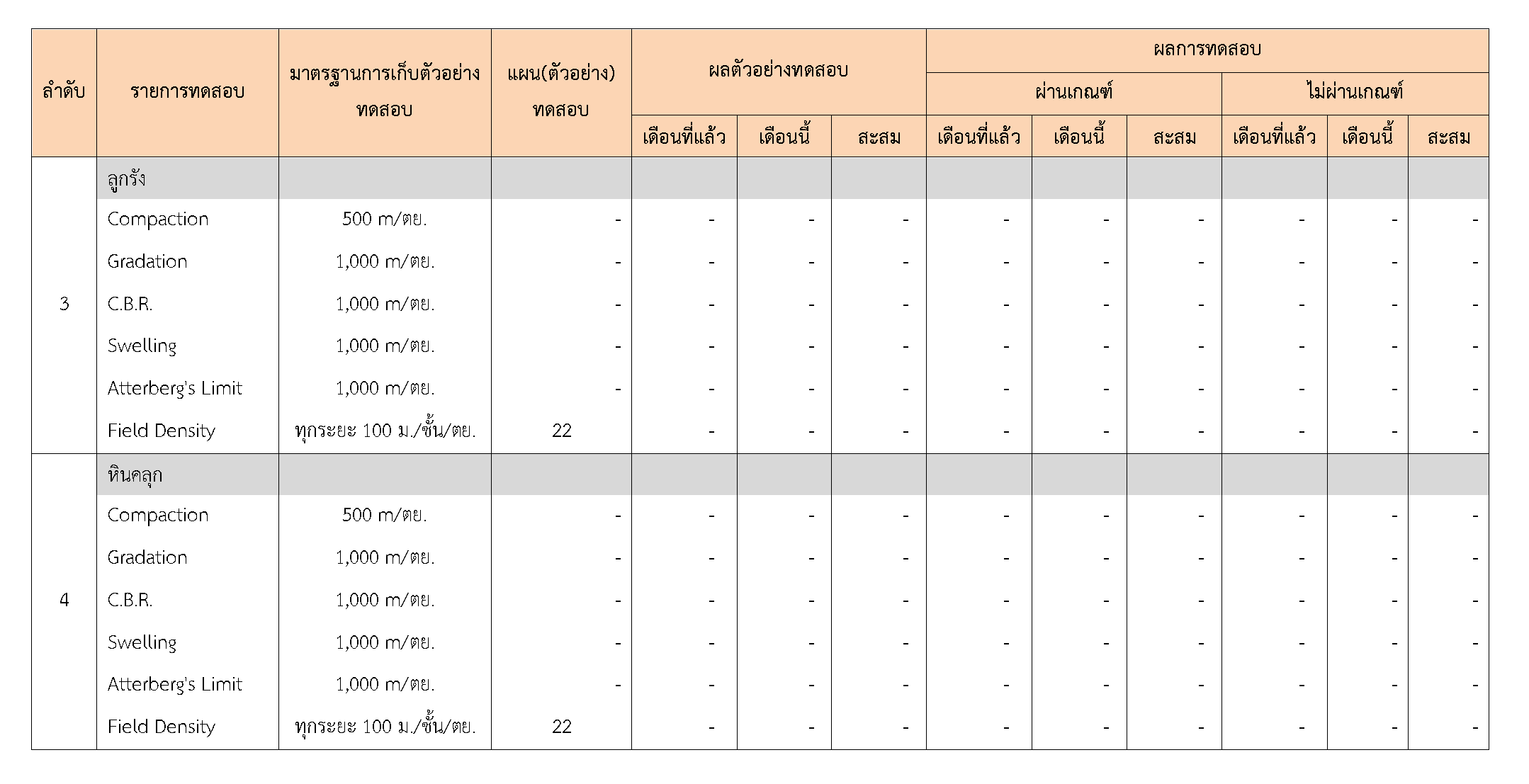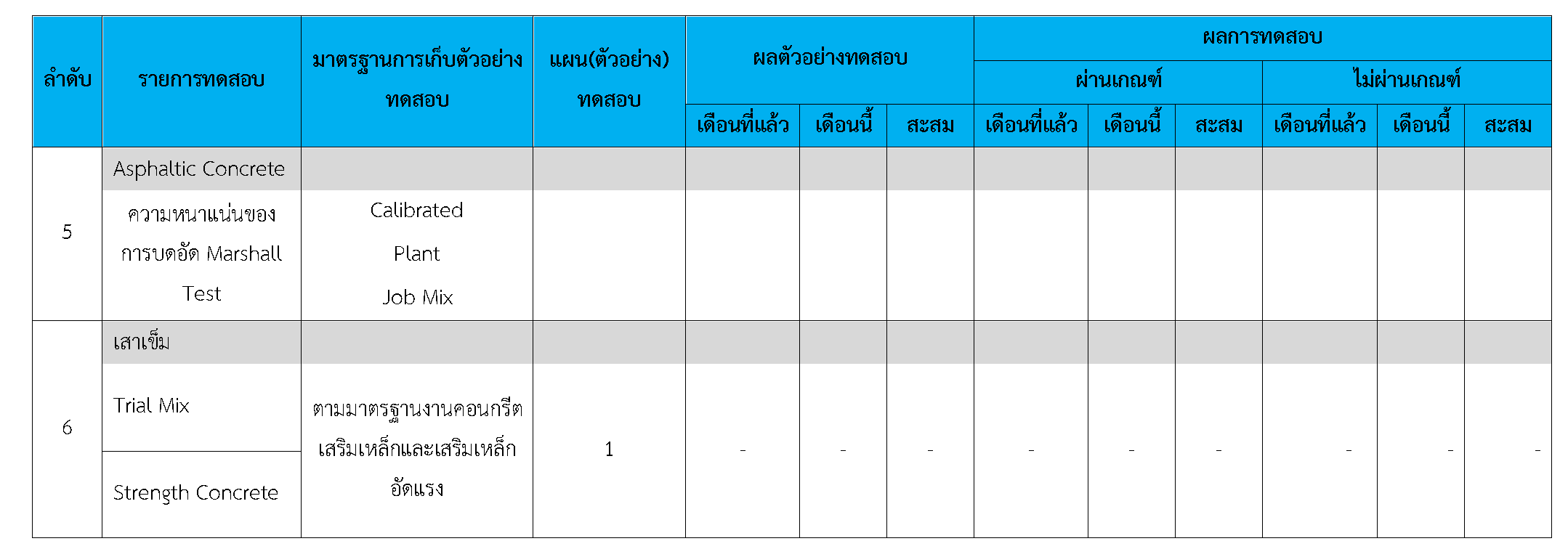 ในระหว่างวันที่ 1-30 เมษายน2561ผู้ว่าจ้างได้เสนอหนังสือขออนุมัติใช้วัสดุถึงที่ปรึกษา โดยที่ปรึกษาได้ตรวจสอบวัสดุดังกล่าวมีผลทดสอบดังตาราง