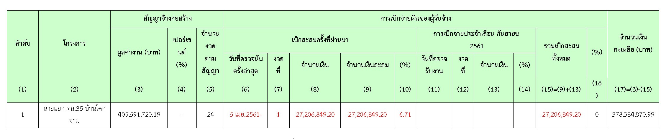 ในเดือน กันยายน 2561มีความก้าวหน้าของงานก่อสร้างที่สามารถตรวจรับงานได้ ดังสรุปในตารางที่ 2.3-1