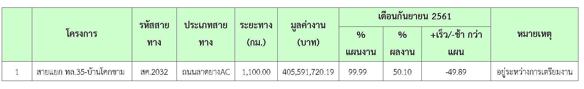 ความก้าวหน้าของเดือน กันยายน 2561ของการปฏิบัติงาน ( 50.10 %) แยกเป็น ดังต่อไปนี้
