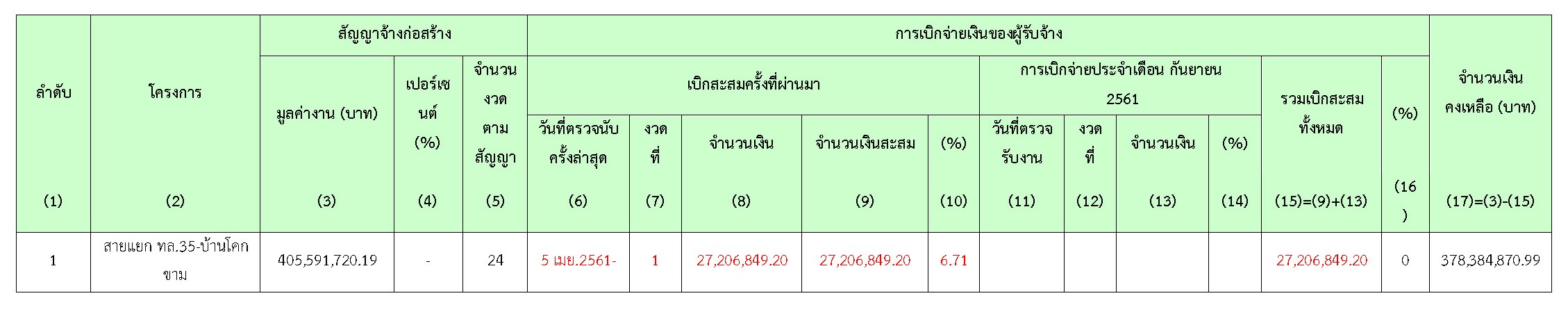 ในเดือน กันยายน 2561มีความก้าวหน้าของงานก่อสร้างที่สามารถตรวจรับงานได้ ดังสรุปในตารางที่ 2.3-1