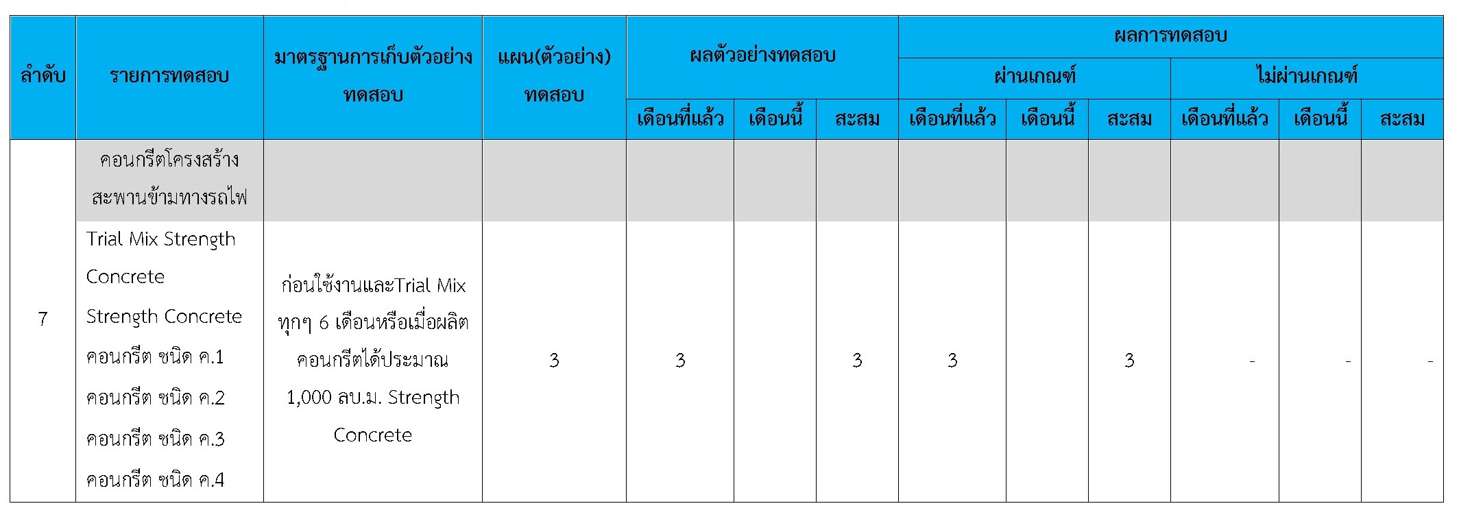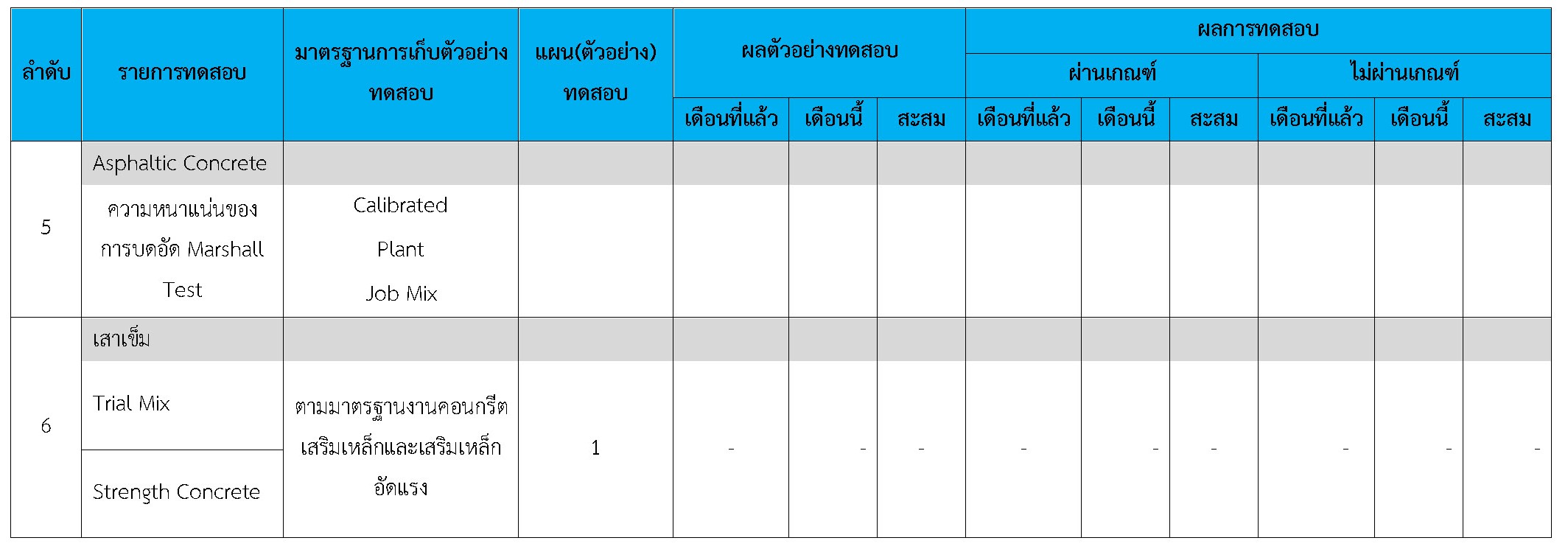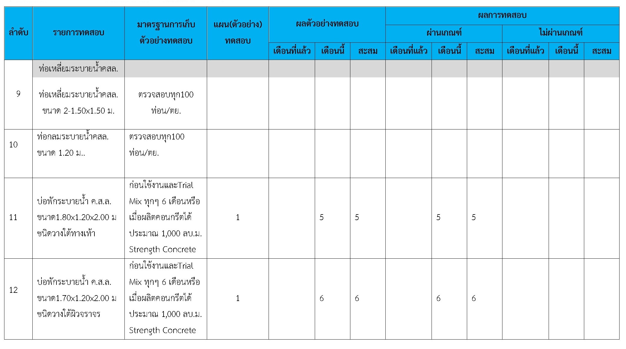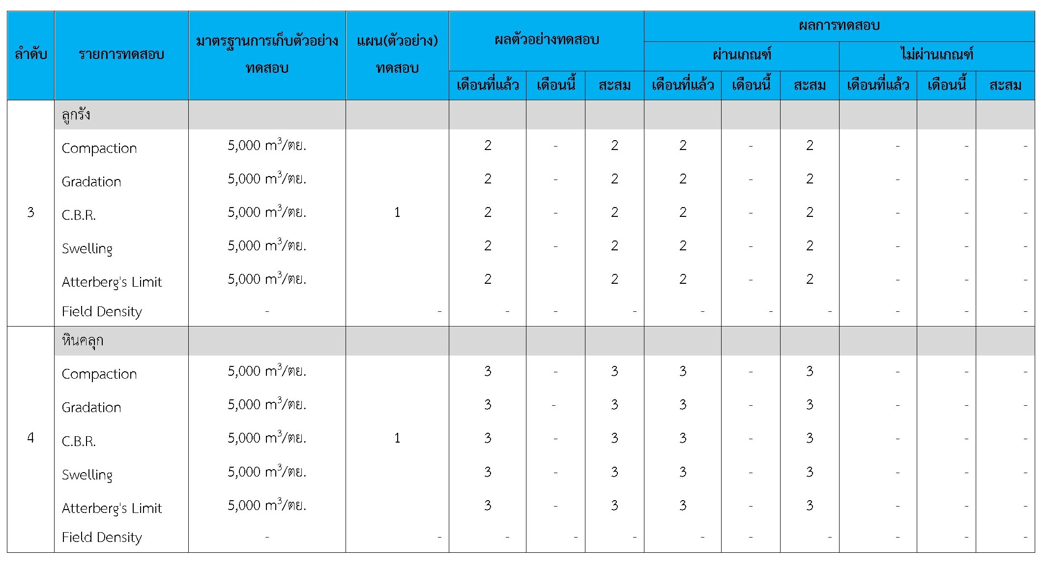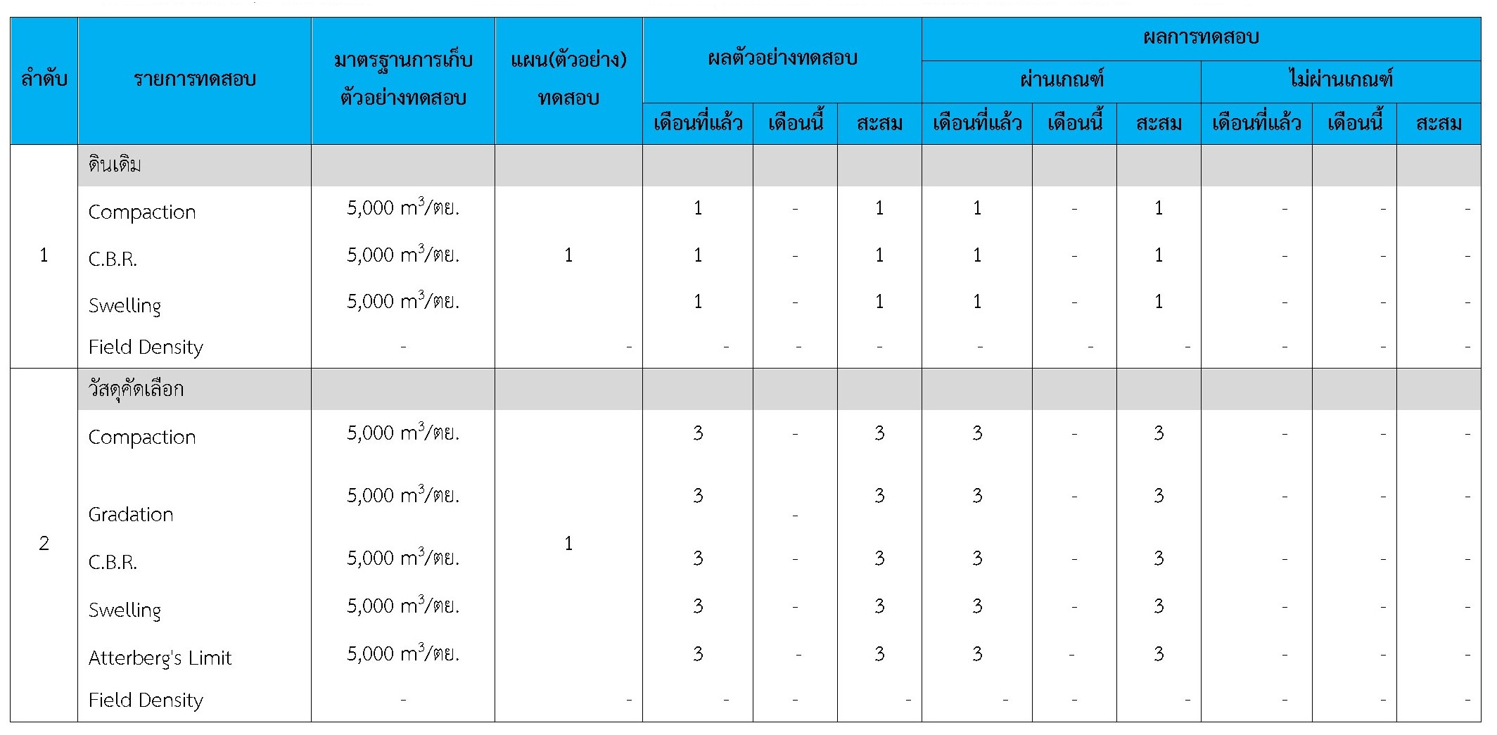 ในระหว่างวันที่ 1-30 กันยายน 2561ผู้ว่าจ้างได้เสนอหนังสือขออนุมัติใช้วัสดุถึงที่ปรึกษา โดยที่ปรึกษาได้ตรวจสอบวัสดุดังกล่าวมีผลทดสอบดังตาราง