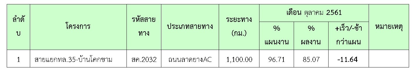 ที่ปรึกษาได้ดำเนินการควบคุมงานก่อสร้าง ในเดือน ตุลาคม 2561มีรายละเอียดการดำเนินงานและความก้าวหน้าของงานตามที่กล่าวในบทที่ 2 ข้อ2.2 รายละเอียดความก้าวหน้าของงานในสายทาง