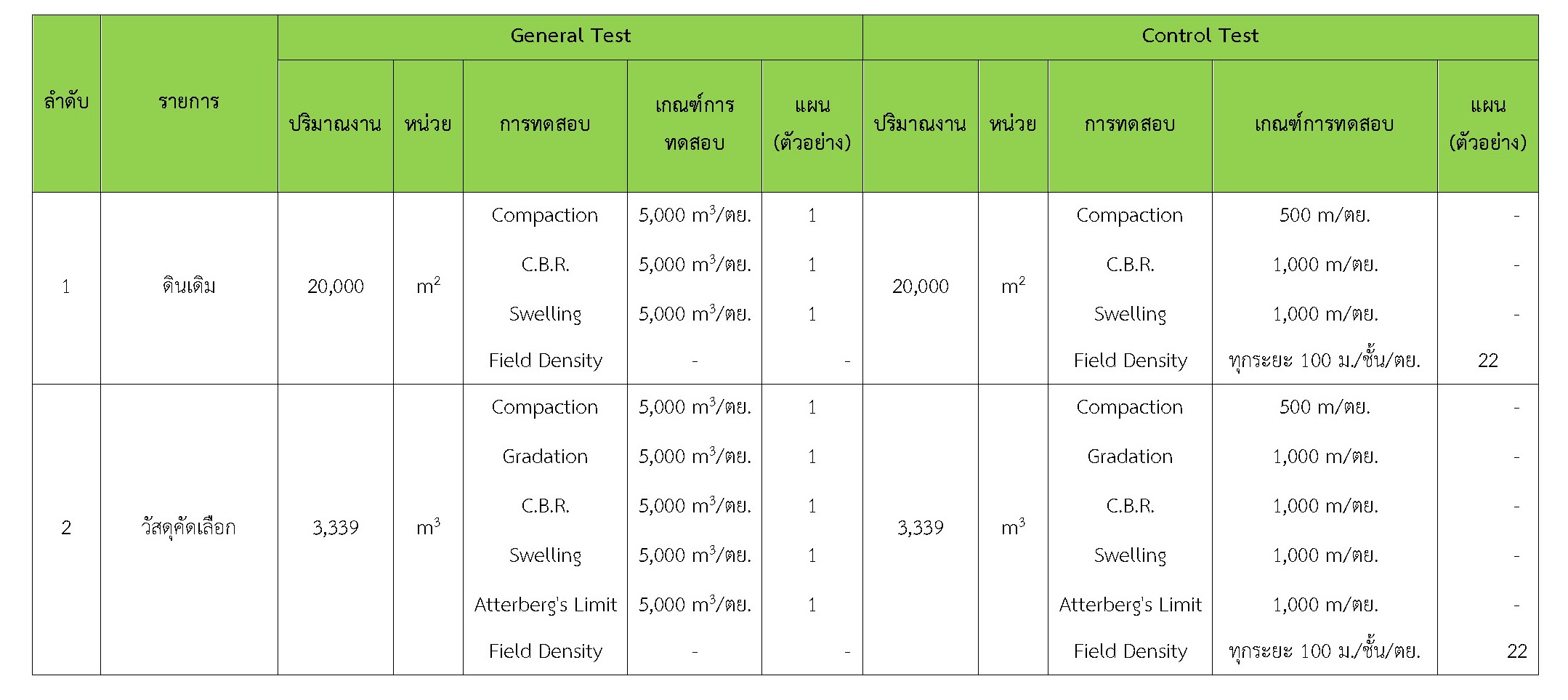 ในเดือน พฤศจิกายน 2561 ได้แสดงเกณฑ์การทดสอบ General Test และ Control Test แสดงไว้ในตารางที่ 3.2-1 – 3.2-3 ดังนี้
