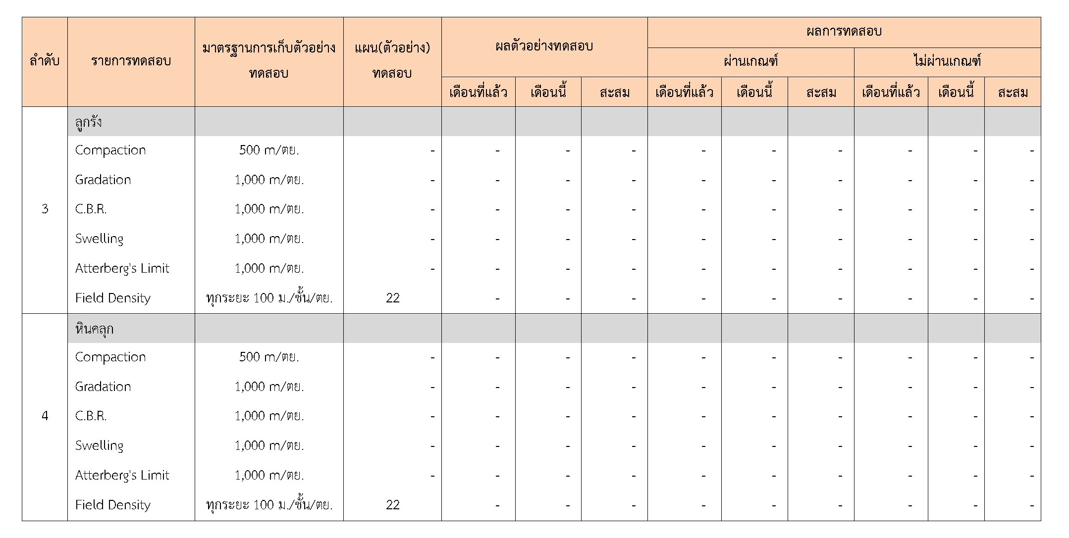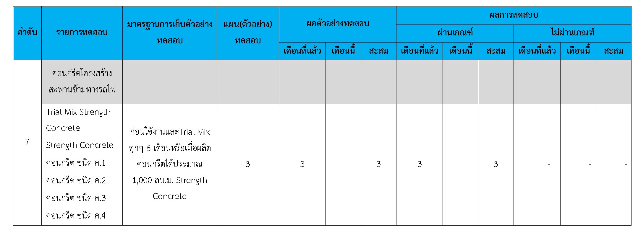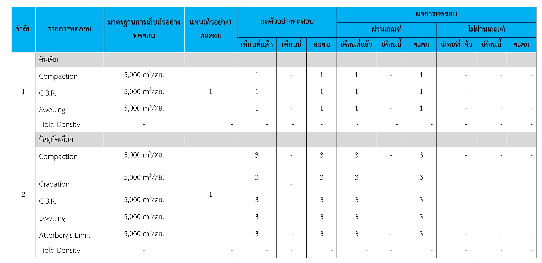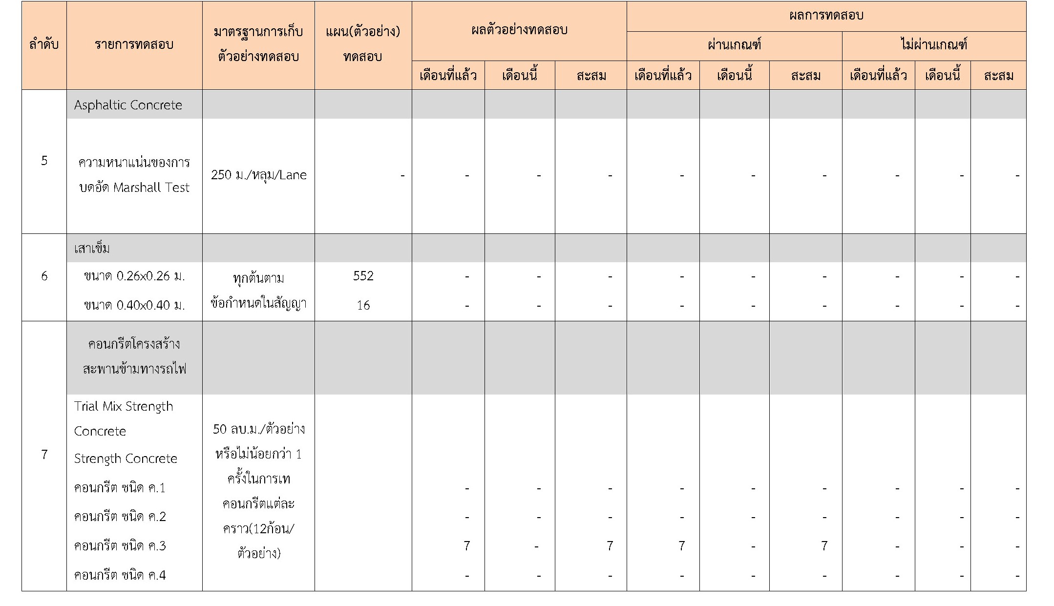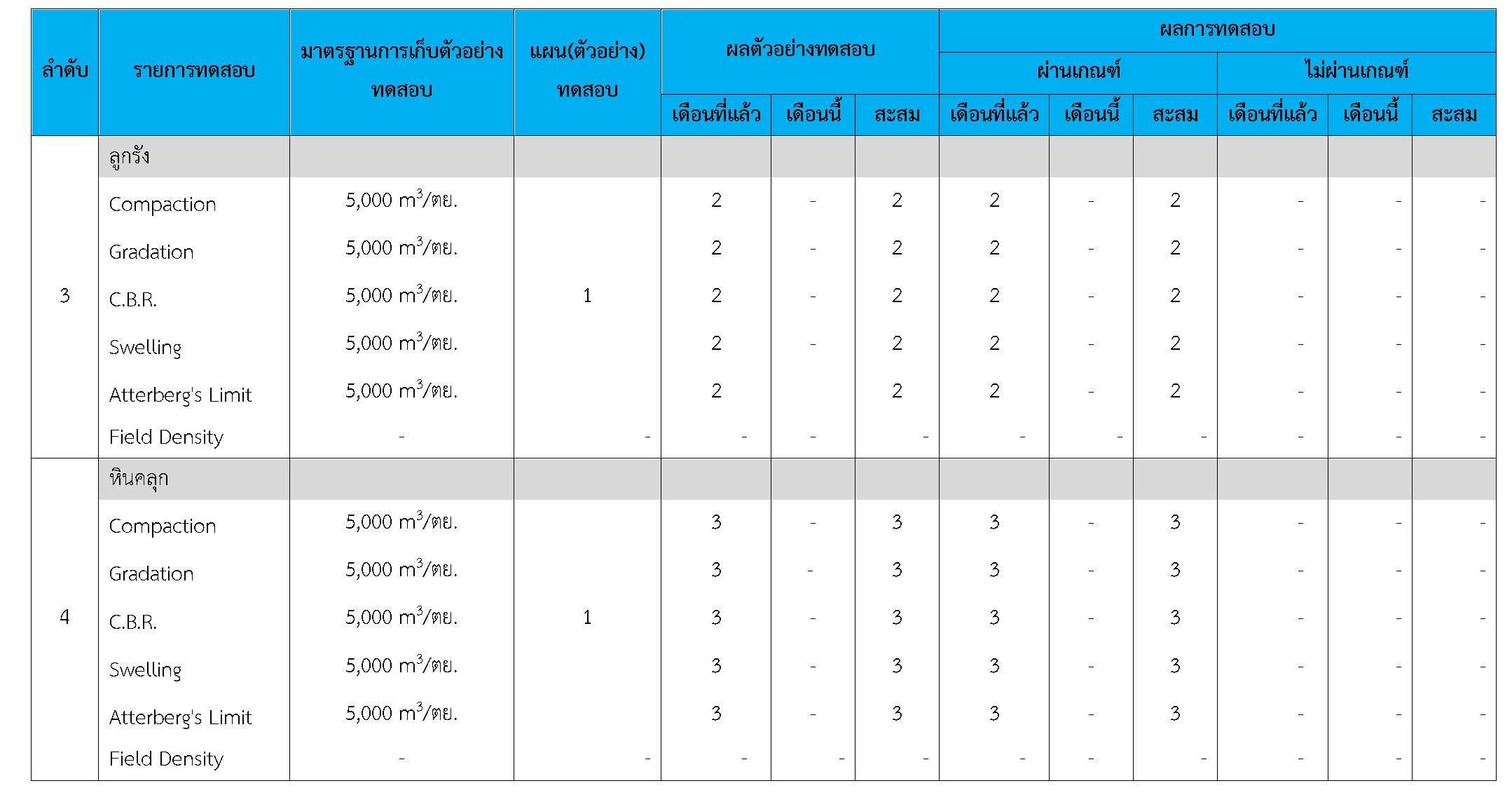 ในระหว่างวันที่ 1-30 พฤศจิกายน 2561 ผู้ว่าจ้างได้เสนอหนังสือขออนุมัติใช้วัสดุถึงที่ปรึกษา โดยที่ปรึกษาได้ตรวจสอบวัสดุดังกล่าวมีผลทดสอบดังตาราง